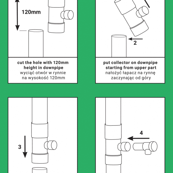 Der Regenwasserkollektor kann für Fallrohre aus PVC und Metall mit einem Durchmesser von 100 mm verwendet werden.